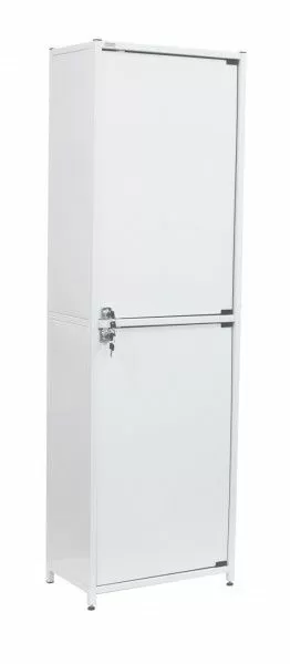 - Шкаф имеет два отделения, каждое из которых укомплектовано металлическими дверцами с замком и металлическими полками. В верхем отделении две полки, в нижнем ― одна.